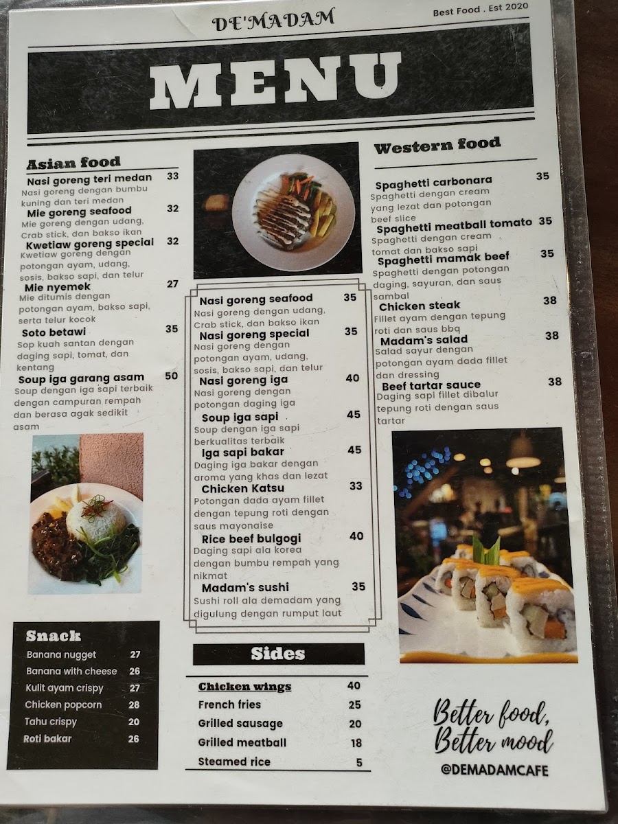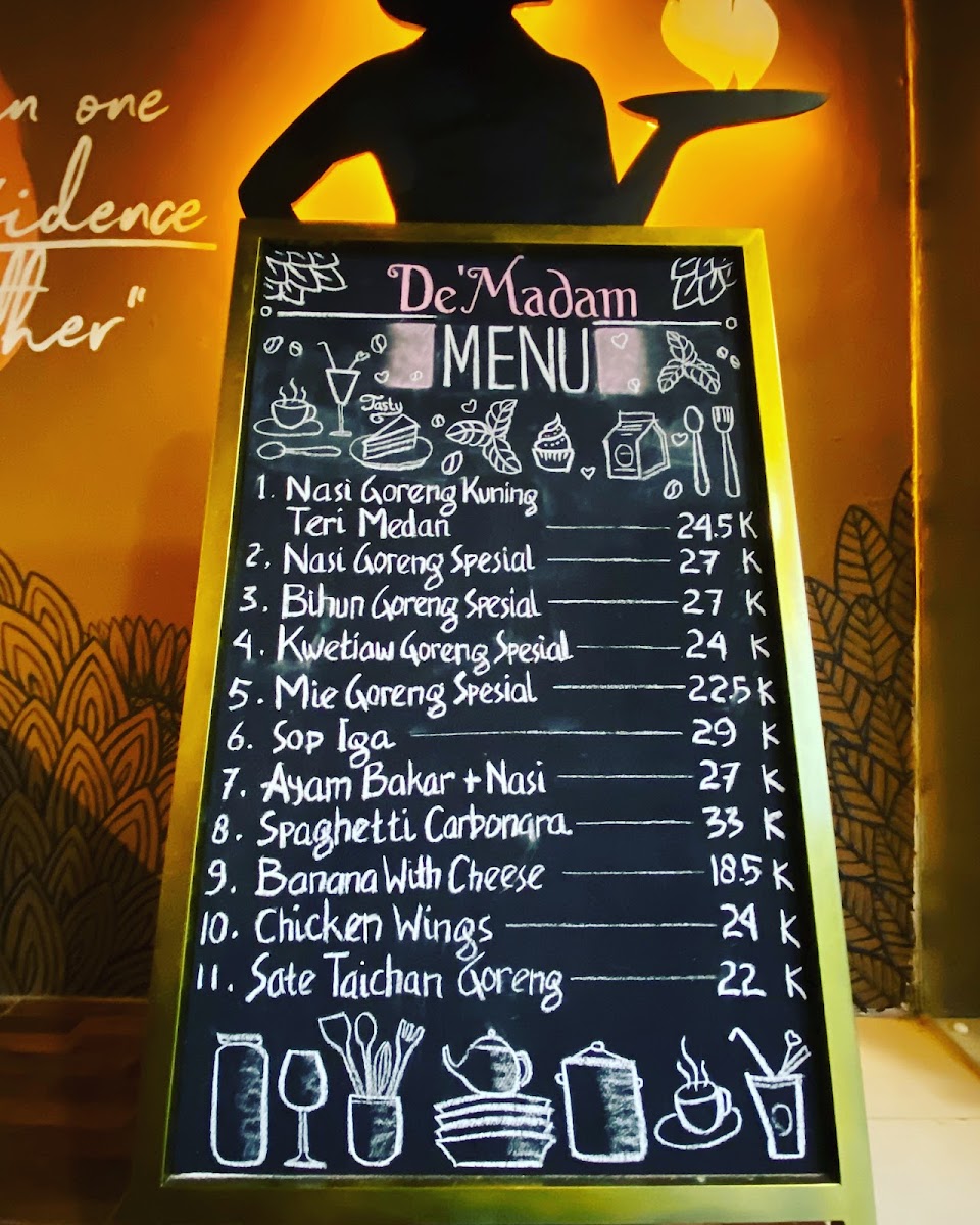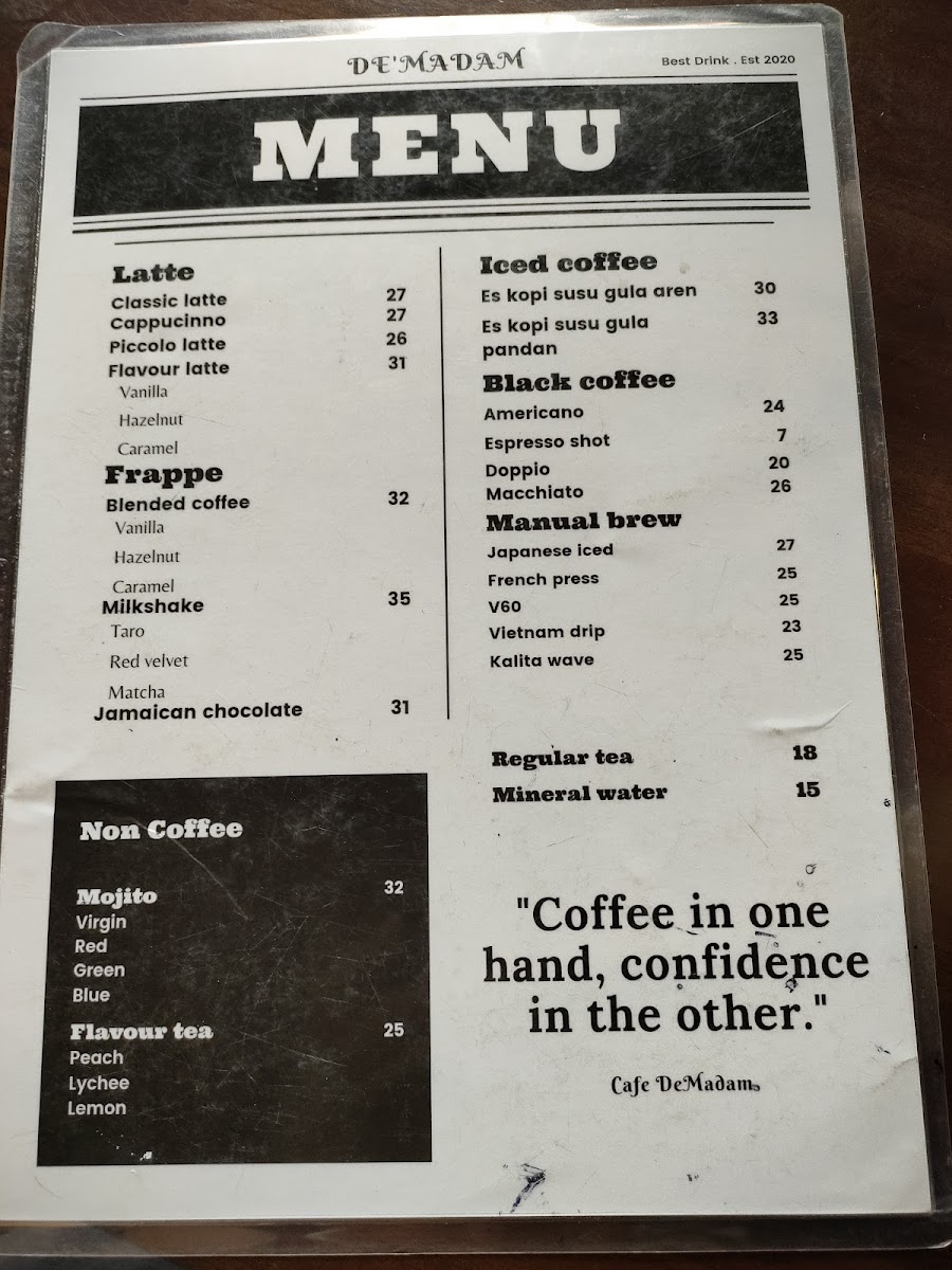 The menu at De'Madam Cafe is a delightful array of offerings that cater to various palates. Indulge in their aromatic coffee, which many customers, like Fais Rotax, have praised for its exceptional flavor. The food, described as 'delicious' by the satisfied diners, is served in generous portions, providing excellent value for your money. Rhea Tsania notes that the quality is fairly priced, making it accessible for both casual visits and special gatherings. Whether you're here for a light meal or a sweet treat, there's something for everyone to enjoy.